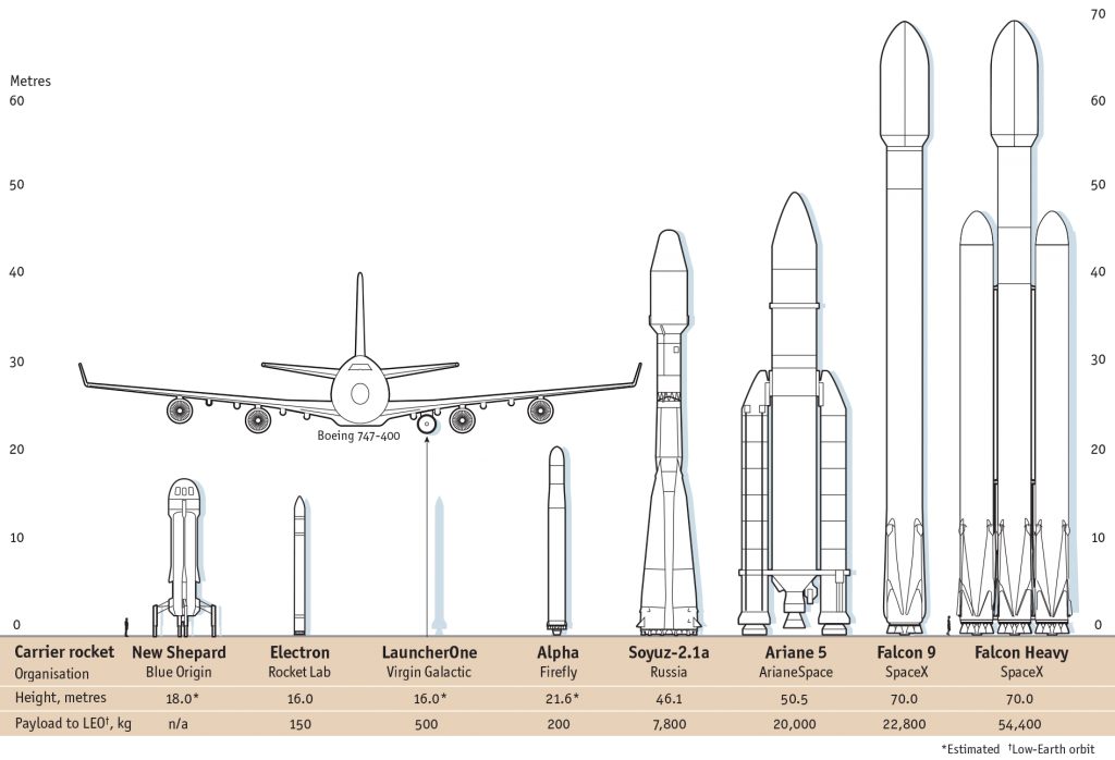 Cuadro comparitivo de los cohetes actuales, sus fabricantes, tamaños y capacidades. Créditos: Rocket Lab; Virgin Galactic; Firefly; ArianeSpace; SpaceX; The Economist.