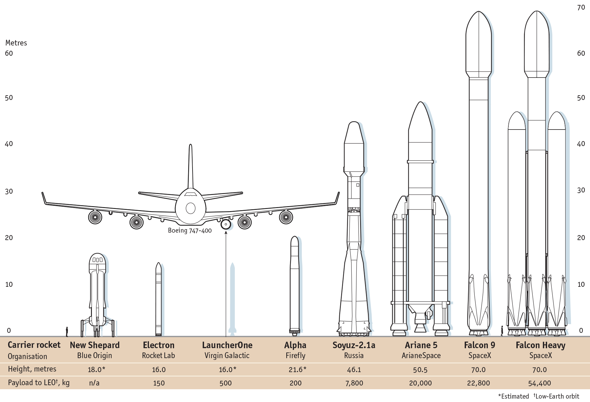 Cuadro comparitivo de los cohetes actuales, sus fabricantes, tamaños y capacidades. Créditos: Rocket Lab; Virgin Galactic; Firefly; ArianeSpace; SpaceX; The Economist.
