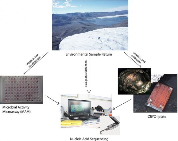 Esta imagen muestra los instrumentos probados en la plataforma de detección de vida. Crédito Imagen: J. Goordial et. Alabama.