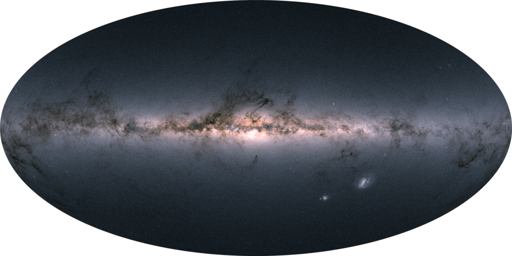 La vista de todo el cielo de Gaia de nuestra Vía Láctea y las galaxias vecinas, basada en mediciones de casi 1.7 mil millones de estrellas. El mapa muestra el brillo y el color total de las estrellas observadas por el satélite de la ESA en cada parte del cielo entre julio de 2014 y mayo de 2016. Más información. Crédito: ESA / Gaia / DPAC.