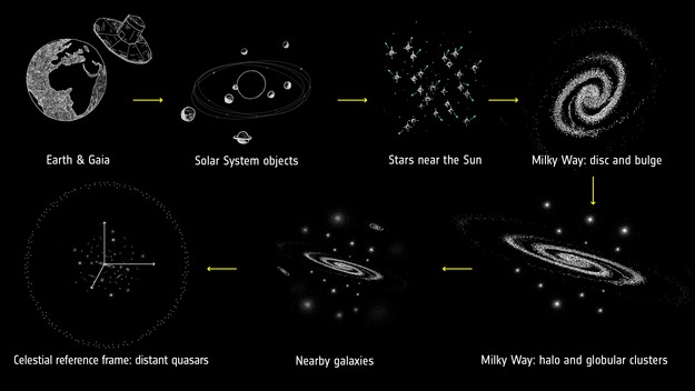 Esta infografía (agrandar imagen) resume las escalas cósmicas cubiertas por este completo conjunto de datos, que ofrece una amplia gama de temas para la comunidad astronómica. El segundo lanzamiento de datos de la misión Gaia de la ESA contiene un catálogo de alta precisión de todo el cielo, que abarca objetos celestes cercanos y lejanos. Incluye objetos como los asteroides en nuestro Sistema Solar, así como la población estelar de nuestra Vía Láctea y sus satélites: cúmulos globulares y galaxias cercanas. También se extiende a cuásares distantes que se utilizan para definir un nuevo sistema de referencia celestial. Crédito: ESA / Gaia / DPAC, CC BY-SA 3.0 IGO.
