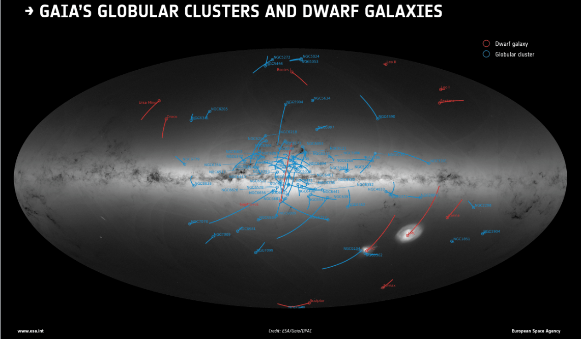 Los datos de Gaia se usaron para derivar las órbitas de 75 cúmulos globulares y 12 galaxias enanas que giran alrededor de la Vía Láctea, proporcionando información de suma importancia para estudiar la evolución pasada de nuestra Galaxia y su entorno, las fuerzas gravitacionales que están en juego y la distribución de la elusiva materia oscura que impregna las galaxias.