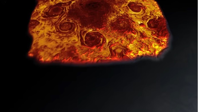 Los científicos de la misión Juno tomaron los datos recopilados por el instrumento Jovian InfraRed Auroral Mapper (JIRAM) de la nave espacial y generaron el vuelo tridimensional del polo norte del mundo joviano. Imaginándose en la parte infrarroja del espectro, JIRAM captura la luz que emerge desde el interior de Júpiter igualmente bien, de noche o de día. El instrumento explora la capa de clima hasta 30 a 45 millas (50 a 70 kilómetros) por debajo de las nubes de Júpiter. Las imágenes ayudarán al equipo a comprender las fuerzas que actúan en la animación: un polo norte dominado por un ciclón central rodeado de ocho ciclones circumpolares con diámetros que varían entre 2,500 y 2,900 millas (4,000 a 4,600 kilómetros).