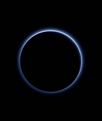 Esta asombrosa imagen de Plutón fue tomada sólo unos minutos después del acercamiento máximo a Plutón el 14 de julio de 2015. La imagen se obtuvo en un alto ángulo de fase, es decir, con el Sol al otro lado de Plutón. Visto aquí, la luz del Sol se filtra e ilumina las complejas capas de neblina atmosférica de Plutón. Las porciones del sur de las llanuras de hielo de nitrógeno informalmente llamadas Sputnik Planum, así como también las montañas del nombre informal “Norgay Montes”, también se pueden ver a través de la media luna de Plutón en la parte superior de la imagen. Al mirar hacia atrás a Plutón con imágenes como esta, los científicos de New Horizons obtienen información sobre las turbiedad de Plutón y las propiedades de la superficie que no pueden obtener a partir de imágenes tomadas al acercarse. La imagen fue obtenida por la cámara Ralph / Multiespectral Visual Imaging (MVIC) de New Horizons, aproximadamente a 13,400 millas (21,550 kilómetros) de Plutón, aproximadamente 19 minutos después del acercamiento máximo de la New Horizons a Plutón. La imagen tiene una resolución de 1,400 pies (430 metros) por píxel. El diámetro de Plutón es de 1,475 millas (2,374 kilómetros). Créditos: NASA/Johns Hopkins University Applied Physics Laboratory/Southwest Research Institute. Ver video.
