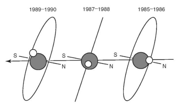 Posiciones relativas observadas de Plutón (en color gris) y Caronte (blanco) asi como del plano de la órbita de esta última, en distintos años. Observar que la dirección Norte Sur de Plutón, está levemente desviada de la trayectoria de Plutón entorno al Sol, que es la línea que une las tres representaciones. Caronte en su órbita pasa frecuentemente entre el Sol y Plutón, protegiendo a este último del viento solar. Crédito: what-when and how.