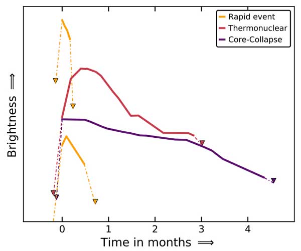 Utilizando datos recogidos por el telescopio espacial Kepler, un equipo internacional de astrónomos dirigido por Brad Tucker de la Universidad Nacional de Australia ha documentado la agonía de una estrella ubicada a 1.300 millones de años luz de distancia. Conocido como KSN 2015K, este FELT sin precedentes alcanzó su brillo máximo en tan sólo 2.2 días, que es 10 veces más rápido que las supernovas estándar. Después de 6.8 días, se redujo a la mitad de su luminosidad máxima, y en el día 25 ya no estaba. Su rápido ascenso y descenso es diferente a todo lo que se haya visto antes, y el ejemplo más dramático de FELT.