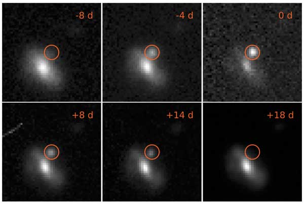 El Programa de Supernova del Sondeo de Energía Oscura (DES-SN) ha detectado un cantidad sorprendente de 72 de estas notables explosiones en galaxias remotas: la cosecha más grande de la historia, gracias al poder de la Cámara de Energía Oscura en el Telescopio Blanco de 4 metros en el Observatorio Interamericano Cerro Tololo en Chile. Las imágenes documentan uno de los 72 transitorios luminosos de evolución rápida (Fast Evolving Luminous Transients, FELT) observados por el Dark Energy Survey.
