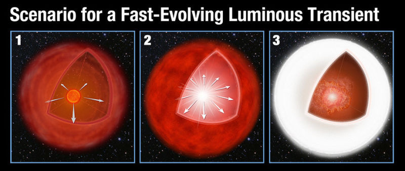 Esta ilustración muestra un modelo propuesto para un misterioso evento astronómico llamado Transitorio Luminoso de Evolución Rápida (FELT). En el panel izquierdo, una estrella gigante roja envejecida pierde masa a través de un viento estelar. Esto se convierte en una enorme capa de gas alrededor de la estrella. En el panel central, el núcleo de la estrella masiva implosiona para desencadenar una explosión de supernova. En el panel de la derecha, la onda de choque de la supernova se introduce en la capa externa, convirtiendo la energía cinética de la explosión en una brillante explosión de luz. El destello de radiación, dura sólo unos pocos días: una décima parte de la duración de una explosión de supernova típica. Créditos: NASA , ESA y A. Feild ( STScI )