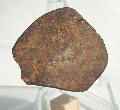 El 26 de Abril de 1803, los meteoritos llovieron sobre la ciudad de L’Aigle en Normandía, Francia. Varias personas, incluidos funcionarios franceses, presenciaron esta lluvia de piedras, que establecieron firmemente que los meteoritos pueden caer y caen del cielo. Después de L’Aigle, los museos y coleccionistas privados comenzaron a incluir meteoritos en sus colecciones. La imagen es una porción completa de un fragmento del meteorito L’Aigle (de aproximadamente 10 g). Tiene las características clásicas de una condrita L 6, que incluye una textura marrón con reflejos grises junto con cóndrulos pequeños, menos distintivos y un poco de metal. El cubo visible debajo es un centímetro cúbico y está incluido para la escala. Este espécimen es parte de la colección de meteoritos del Dr. Martin G. Horejsi, una de las colecciones privadas más grandes de meteoritos históricos que fueron testigos de la caída. Crédito: Martin Horejsi.