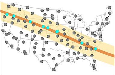 Fig. 1. Estaciones de USCRN en la trayectoria del eclipse solar total del 21 de agosto de 2017 (círculos azules). Tenga en cuenta que el sexto círculo azul de la izquierda (en el sureste de Nebraska) representa dos estaciones cercanas.