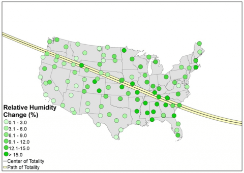 Como se esperaba, los mayores impactos del eclipse se encontraron a lo largo de su línea central. Otros factores como la nubosidad y la cobertura vegetal también afectaron las respuestas tierra-atmósfera. Afortunadamente para este intento de medir exactamente los impactos del oscurecimiento solar , la Luna bloqueó el Sol a una hora del día cuando la radiación solar era fuerte y la mayoría de los Estados Unidos tenían poca cobertura de nubes.