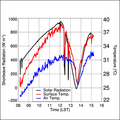 Otras mediciones proporcionaron información adicional sobre los rápidos cambios en la energía cercana a la superficie durante el eclipse. El flujo de calor sensible, o la transferencia de calor de la superficie de la Tierra a la atmósfera, disminuyó a casi 0 vatios por metro cuadrado alrededor de la totalidad, pero aumentó hacia el final de la fase parcial.