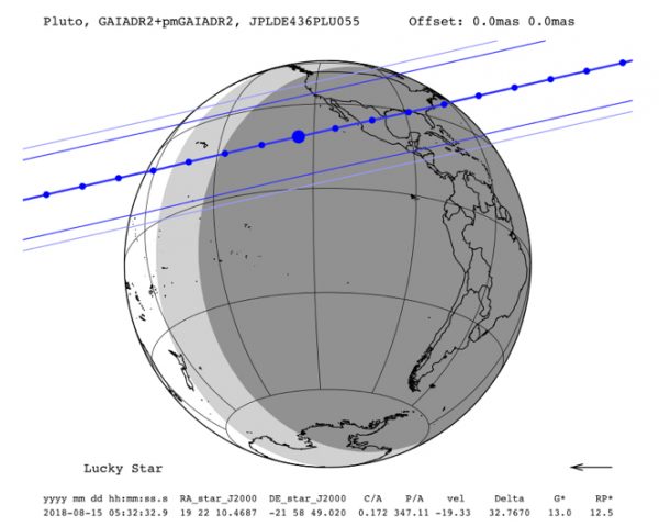 Ruta de la ocultación por Plutón del 15 de Agosto de 2018  derivada del nuevo catálogo de GAIA DR2 y la órbita mutua del sistema Plutón-Charon. (Crédito: Lucky Star).