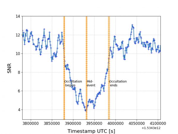 Pasó el tiempo … Estábamos mirando la pantalla de la cámara EMCCD cada vez más temerosos de que algo hubiera salido mal porque no era obvio que la estrella estaba desapareciendo como se esperaba. De hecho, como muestra el video del eVscope, sucedió que habíamos subestimado el hecho de que Plutón tiene una magnitud de ~ 1.5 menos que la estrella, por lo que aún era visible con la potente cámara EMCCD.