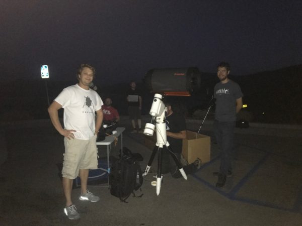 Nos encontramos en Lake Henshaw Overlook, un pintoresco lugar famoso por sus hermosas vistas y cielos nocturnos oscuros. Un equipo diverso, compuesto por los empleados de OPT (Chris HENDREN, Ian Lauer, Blake Estes, Rod Gallardy), un estudiante de doctorado del Observatorio de París (Joana Oliveira Marques), un reportero del Planetario Radio (Mat Kaplan),  El asistente de laboratorio del Instituto SETI (Martin Costa) y yo nos encontramos en el mirador el 14 de Agosto a las 7 p.m. Instalamos rápidamente nuestras estaciones, con el poderoso prototipo eVscope de Unistellar operado por Martin y yo por un lado y un Celestron C14 equipado con una cámara EMCCD administrada por Joana y el equipo OPT por el otro. Esta fue realmente una colaboración ProAm que incluyó a trabajadores calificados del mundo de la investigación académica y compañías con fines de lucro.
