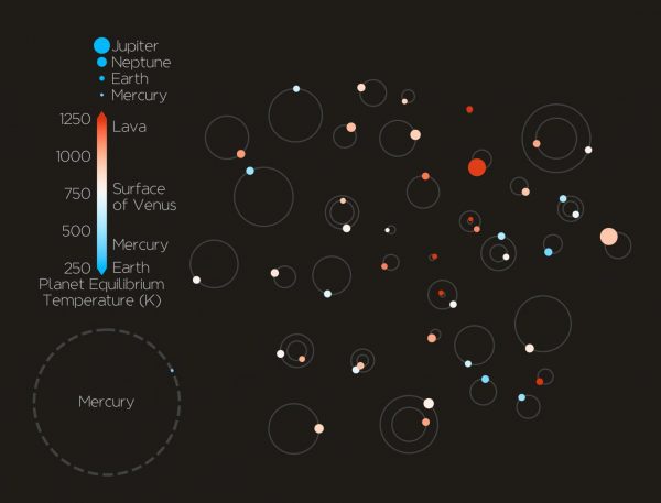 Los 44 planetas confirmados y su clase de tamaño aproximado, órbitas y temperaturas de superficie. Ver video. Crédito: John Livingston.