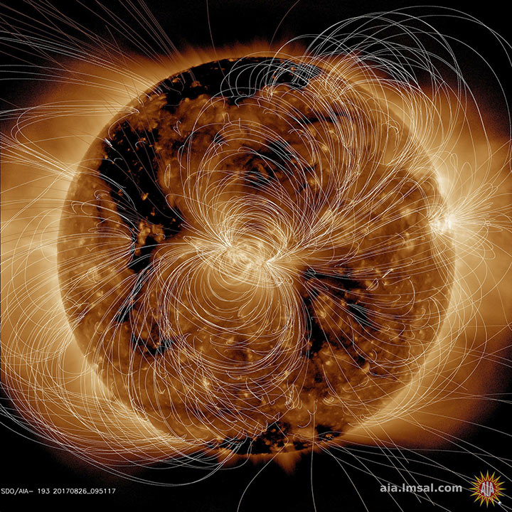 Todos los días los científicos usan sus modelos de computadora para generar una vista del campo magnético del Sol (10 de agosto de 2018). Aprovechamos la oportunidad para comparar una vista ultravioleta extrema del Sol con la misma imagen que muestra las líneas de campo superpuestas. La región activa brillante en el área central del sol muestra claramente una concentración de líneas de campo, así como la pequeña región activa en el borde derecho del sol, pero en menor medida. El magnetismo impulsa la actividad dinámica cerca de la superficie del sol. Crédito: Observatorio de Dinámica Solar, NASA.