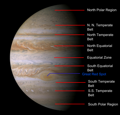 Sistema de Cinturones atmosféricos en Júpiter. Este mosaico de Júpiter fue construido a partir de imágenes tomadas por la cámara de ángulo estrecho a bordo de la nave espacial Cassini de la NASA el 29 de Diciembre de 2000, durante su aproximación más cercana al planeta gigante a una distancia de aproximadamente 10 millones de kilómetros (6.2 millones de millas). Más información. Crédito Wikipedia.