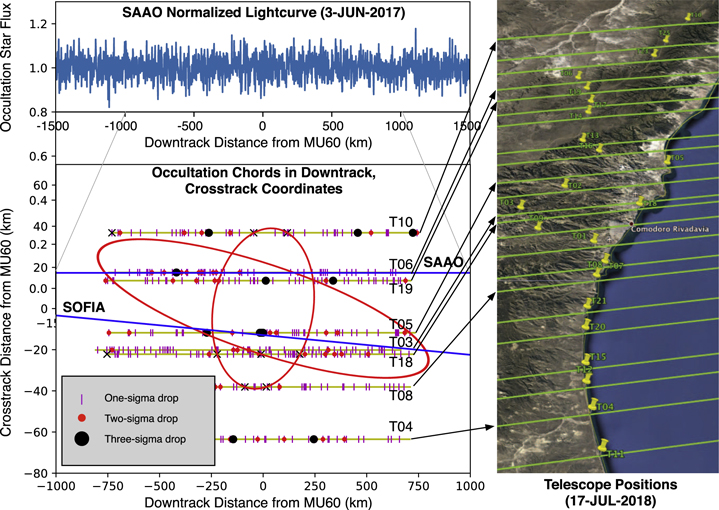 Jóvenes y colaboradores exploraron los datos obtenidos en tres fechas en el verano de 2017: el 3 de Junio, desde Sudáfrica y Argentina, el 10 de Junio, desde el observatorio aéreo SOFIA, y el 17 de Julio, desde Argentina. En esos días, los telescopios se ensamblaron con el objetivo de capturar el MU69 2014 cuando se cruzaba frente a una estrella de fondo, bloqueando brevemente la luz de la estrella.
