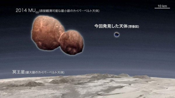 El objeto es mucho más pequeño que Ultima Thule de 30 km de largo , fotografiado a principios de Enero por la nave espacial New Horizons de la NASA. El paisaje inferior corresponde a una zona montañosa en Plutón. Créditos: