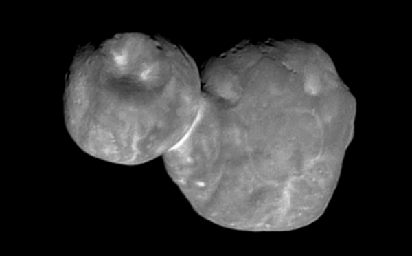 Imagen en blanco y negro de Ultima Thule (2014MU69) obtenida por New Horizons en la víspera de año nuevo de 2019. Se ve claramente que el objeto se formó por la colisión a muy baja velocidad de dos planetesimales. Crédito: NASA / JHUAPL / SwRI.