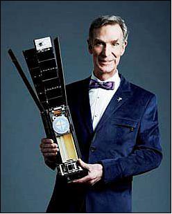 Bill Nye con un modelo de ingeniería a escala completa del LightSail 3U CubeSat desarrollado por Stellar Exploration, Inc.