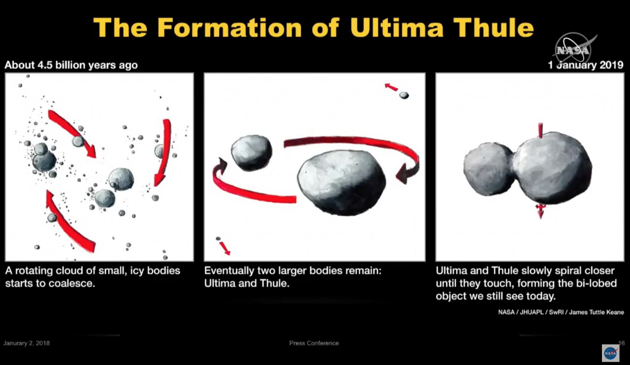 Los lóbulos probablemente una vez orbitaron entre sí, como muchos de los llamados mundos binarios en el Cinturón de Kuiper, hasta que algún proceso los reunió en lo que los científicos han demostrado que es una fusión “suave”. Para que eso suceda, gran parte del impulso orbital del binario debe haberse disipado para que los objetos se unan, pero los científicos aún no saben si eso se debió a las fuerzas aerodinámicas del gas en la antigua nebulosa solar, o si Ultima y Thule expulsaron a otros lóbulos que se formaron con ellos para disipar energía y reducir su órbita. La alineación de los ejes de Ultima y Thule indica que, antes de la fusión, los dos lóbulos debieron haberse bloqueado en forma de mareas, lo que significa que los mismos lados siempre se enfrentaron mientras orbitaban alrededor del mismo punto.