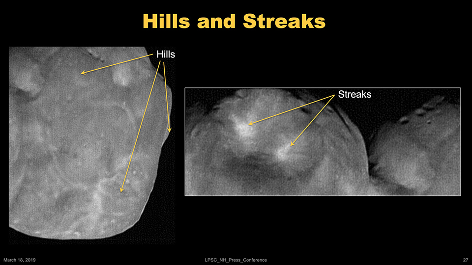 Distintos tipos de rasgos superficiales de Ultima Thule, en particular el cráter Maryland de 8 kilómetros de ancho, semejante al cráter Stickney en la luna Fobos (Phobos en Inglés) de Marte.