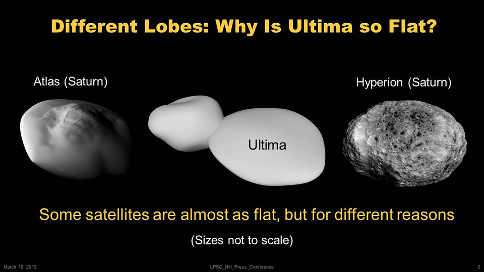 Los datos iniciales resumidos en Science revelan mucho sobre el desarrollo, la geología y la composición del objeto. Es un binario de contacto, con dos lóbulos de formas distintas. Con aproximadamente 36 kilómetros de largo, Ultima Thule consiste en un lóbulo grande, extrañamente plano (llamado “Ultima) conectado a un lóbulo más pequeño, algo más redondo (llamado “Thule”), en una coyuntura llamada “el cuello”. Cómo estos dos lóbulos obtuvieron su forma inusual es un misterio imprevisto que probablemente se relaciona con la forma en que se formaron hace miles de millones de años.