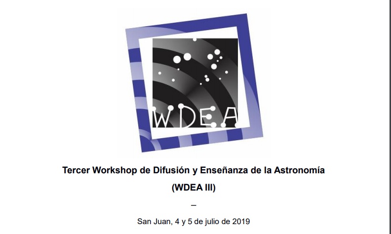 Luego del éxito de las primeras ediciones, WDEA I realizado en la ciudad de Córdoba con motivo del Año Internacional de la Astronomía (2009) y WDEA II, realizado en la ciudad de Esquel (2017), en coincidencia con el eclipse anular de Sol, tenemos el agrado de invitarlos a participar en el Tercer Workshop de Difusión y Enseñanza de la Astronomía (WDEA III).