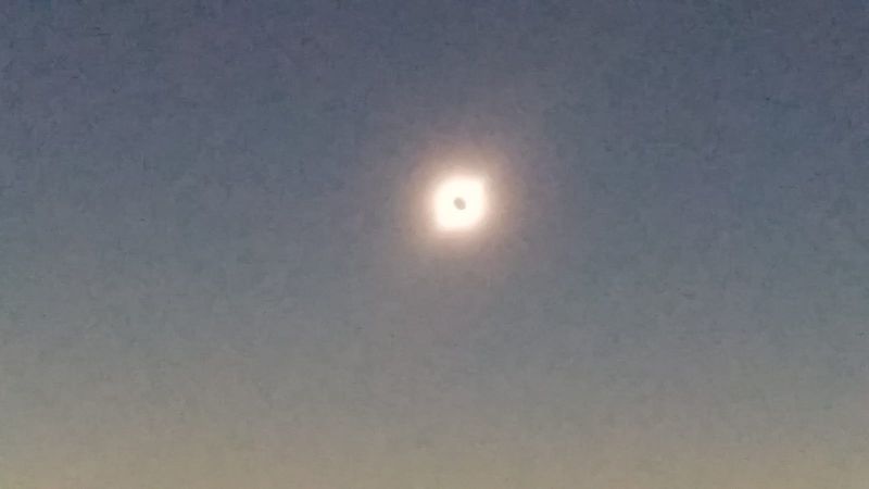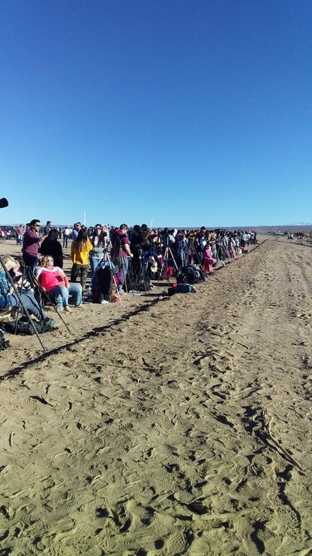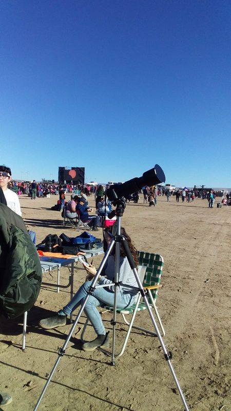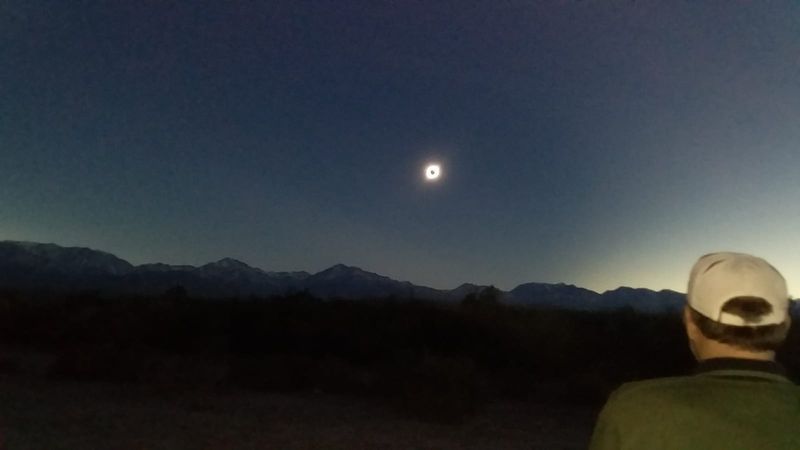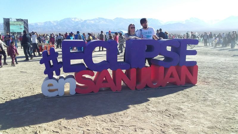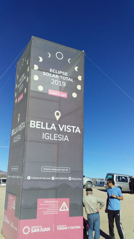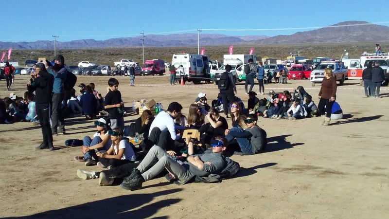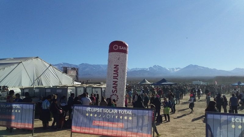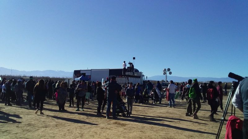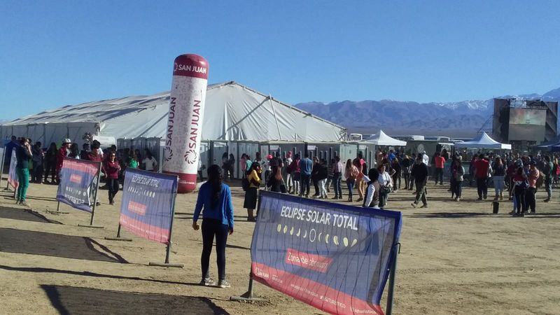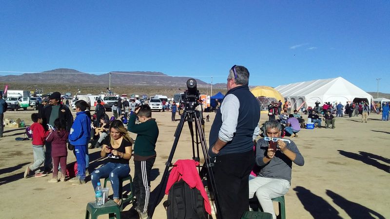 Carlos Costa: Aquí en San Juan la conexión a Internet no es buena. Voy a tratar de enviar las mejores imágenes. Mientras tanto, les comento que la Gobernación de San Juan realizó un despliegue impresionante para el eclipse, coordinando acciones entre la Universidad de San Juan, el Ministerio de Turismo y Cultura y la Gendarmería, para brindarle al público asistente un espacio de observación con todos los servicios necesarios, ubicado justo en el centro del camino de la sombra de la Luna, en la localidad de Bella Vista, zona con la mejor estadística meteorológica de visibilidad en dicho camino.