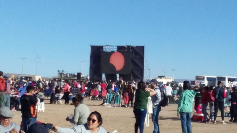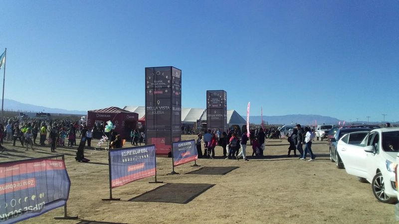 Dos enormes carpas que alojaban varios puestos que ofrecían, comida, artesanías, prendas etc. Un puesto del Ministerio de Turismo y Cultura que regalaba al público lentes de observación solar, un escenario donde bandas del lugar entretenían al público, y detrás del escenario, una enorme pantalla, que alternaba imágenes de la evolución del eclipse con la de la banda y propaganda.