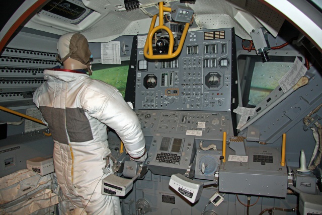 Cabina y Cockpit del Módulo Lunar. Protegido por las barras amarillas está el visor del telescopio del sextamte Entre los dos puestos de comando y en la parte inferior del Cockpit (a la derecha de la mano del manequí) están el teclado y el display de la Computadora de Navegación Guiado y Control. Crédito: NASA.