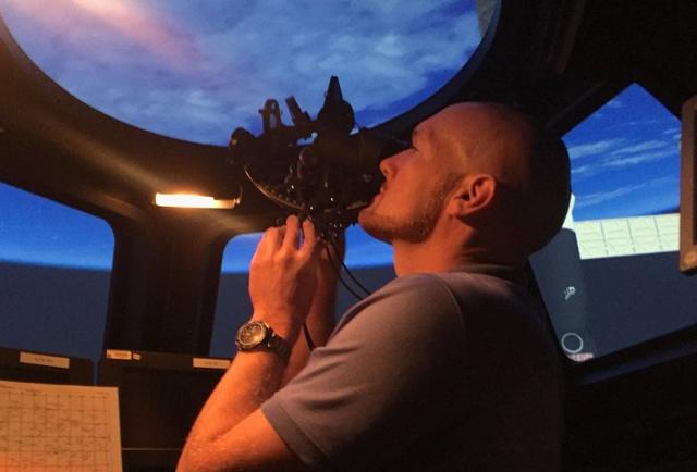 El astronauta Alexander Gerst aprende a usar un sextante en una maqueta del Módulo de la Cúpula de la ISS. Crédito: NASA.