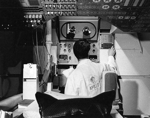 Un técnico del Massachusetts Institute of Technology (MIT) ingresando datos en la consola de la Computadora de Navegación, en un simulador del Módulo de Comando de una Nave Apolo. Frente a él y por encima está el sistema del sextante. Crédito: MIT.