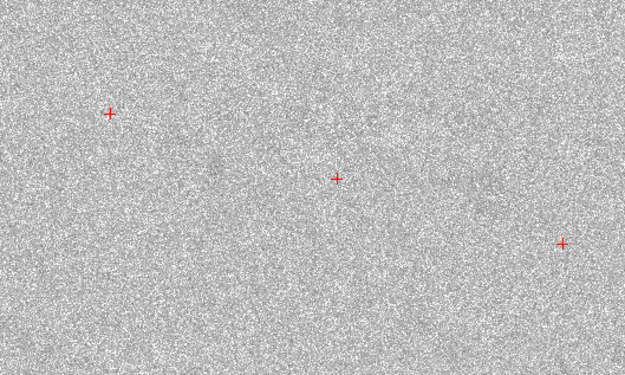 La imagen de arriba muestra la región del cielo donde se habría visto el asteroide 2006 QV89 si estuviera en un curso de colisión con la Tierra este año. Las tres cruces rojas revelan las ubicaciones específicas, donde el asteroide podría haber aparecido como una fuente única, brillante y redonda, si hubiera estado en curso de colisión.