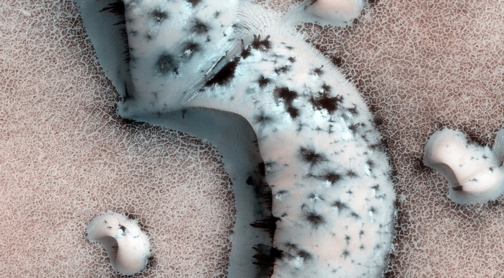 Agrandar imagen. Los casquetes polares en Marte son una combinación de agua helada y CO2 congelado. Al igual que su forma gaseosa, el CO2 congelado permite que la luz solar penetre mientras atrapa el calor. En el verano, este efecto invernadero de estado sólido crea focos de calentamiento debajo del hielo, vistos aquí como puntos negros en el hielo. Más información.