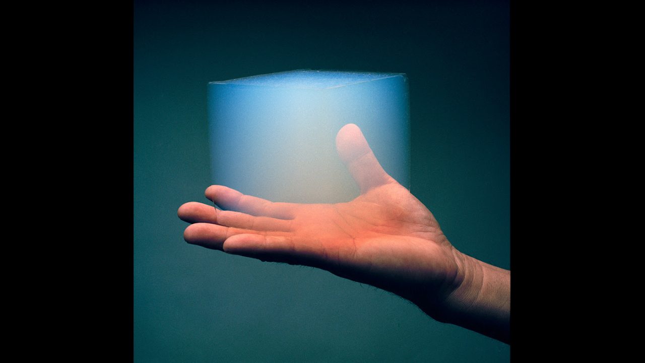 Sosteniendo un bloque de Aerogel. Material 97 % poroso, extremadamente liviano y aislante. Permite pasar la luz, pero bloquea la UV. Su estructura en nanocapas interconectadas reduce considerablemente la conducción de calor.