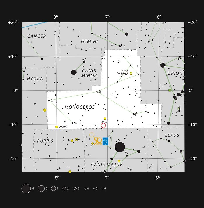 Este gráfico muestra la ubicación de la cabeza de la Nebulosa de la Gaviota (círculo rojo) en la constelación de Monoceros (El Unicornio) y no lejos de la estrella más brillante del cielo, Sirio. Esta región de formación estelar es parte de la Nebulosa de la Gaviota más grande (IC 2177), que se extiende a través de la frontera hacia el vecino Canis Major (El Gran Perro). Por coincidencia, este objeto se encuentra muy cerca en el cielo de la ubicación de la Nebulosa del Casco de Thor (NGC 2359, marcado con un círculo naranja y el logotipo de ESO 50). Este objeto inusual fue el ganador del concurso Choose what the VLT Observes (ann12060 ).