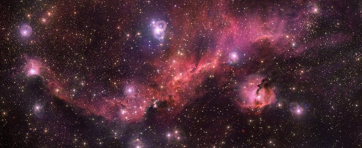 Es la radiación que emana de estas estrellas jóvenes lo que le da a las nubes sus colores fantásticos y las hace tan llamativas, al ionizar el gas circundante y hacer que brille. Esta radiación también es el factor principal que determina las formas de las nubes, al ejercer presión sobre el material circundante y esculpirlo en las morfologías caprichosas que vemos. Dado que cada nebulosa tiene una distribución única de estrellas y puede, como esta, ser un compuesto de múltiples nubes, vienen en una variedad de formas, disparando la imaginación de los astrónomos y evocando comparaciones con animales u objetos familiares.