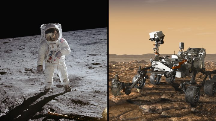 De izquierda a derecha: el astronauta del Apolo 11 Buzz Aldrin se para en la Luna; 47 libras (21.5 kilogramos) de muestras fueron traídas a la Tierra por esa misión; El rover “Mars 2020”, visto aquí en una representación artística, tomará las primeras muestras planetarias en el cráter Jezero, en Marte (a la derecha). Crédito: NASA / JPL-Caltech.