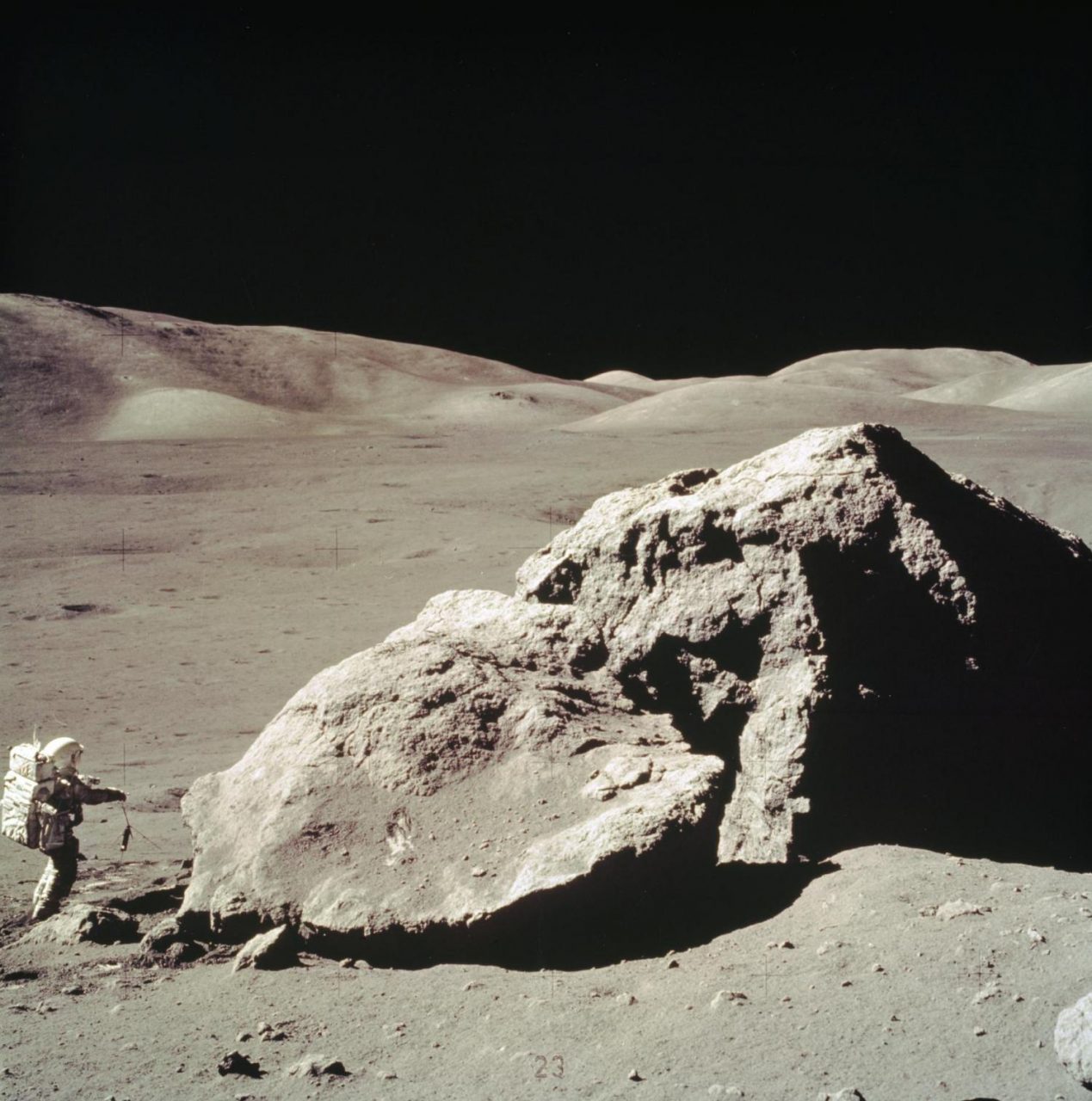 El Astronauta y Geólogo Harrison Schmitt de Apolo 17, cerca de una roca en el valle Tauro-Littrow de la Luna.