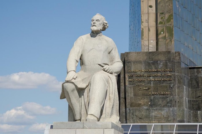 En el corazón de Moscú, existe un monumento a Konstantin Tsiolkovsky, el científico fundador de los vuelos espaciales modernos y la astronáutica. Está conmemorado con esta estatua en la parte inferior del monumento del obelisco de “Conquistadores del espacio” en Moscú .