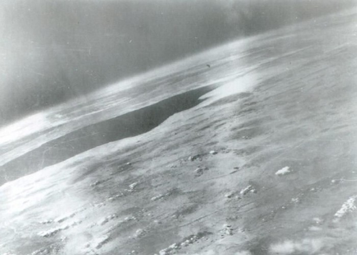 El primer fotograma (1946) de la curvatura de la Tierra, visto desde un cohete lanzado por humanos. El cohete V-2 alemán, junto con la mayoría de los científicos de cohetes, fueron traídos a los EE. UU. después de la Segunda Guerra Mundial, pero los soviéticos lograron hacerse con los planos y algunos científicos e ingenieros. Contemporáneamente con esta imagen generada en Estados Unidos, el equipo de Korolev estaba construyendo una versión rusa del V-2, el cohete R-1.
