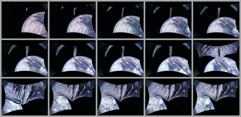 Estas imágenes muestran la progresión de la secuencia de despliegue de la vela solar de LightSail 2, que comenzó el 23 de julio de 2019 a las 18:47 UTC. Todas son imágenes en miniatura de la Cámara 1 con una resolución original de 120 por 90 píxeles y se han distorsionado y corregido el color. Los primeros 13 cuadros fueron tomados a intervalos de 10 segundos; los restantes a intervalos de 30 segundos.
