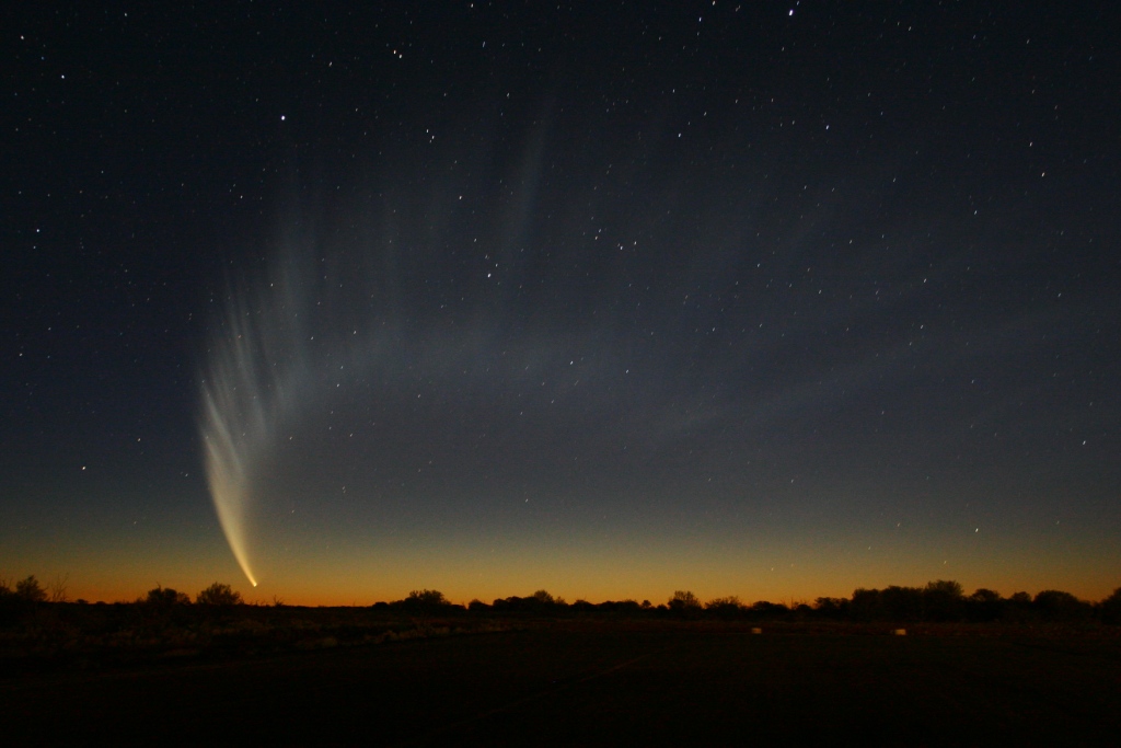 Cometa McNaught C/2006 P1, fotografiado el 20 de Enero de 2007 desde Lawlers, Western Australia. El viento y la luz solar desvían la cola de los cometas.