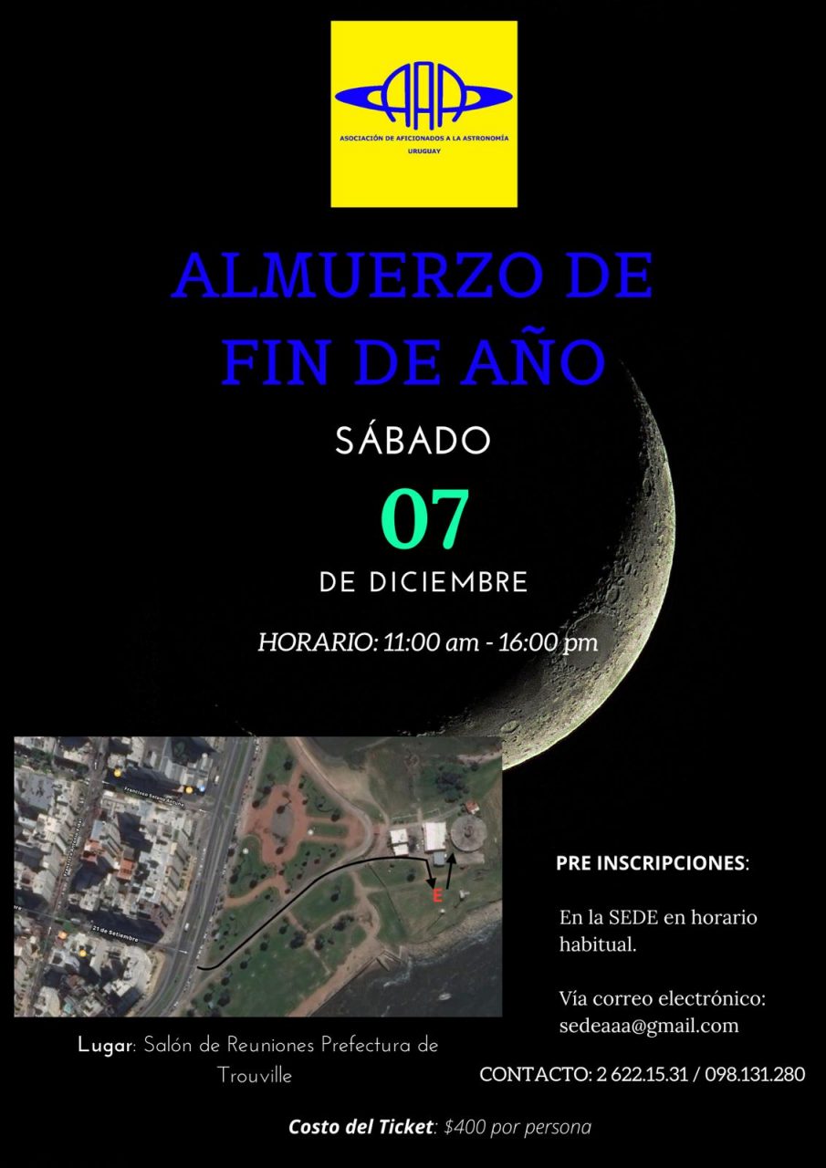 Invitamos al almuerzo de fin de año de la Asociación de Aficionados a la Astronomía. Se realizará el sábado 7 de diciembre desde las 11 de la mañana hasta 16 horas de la tarde.