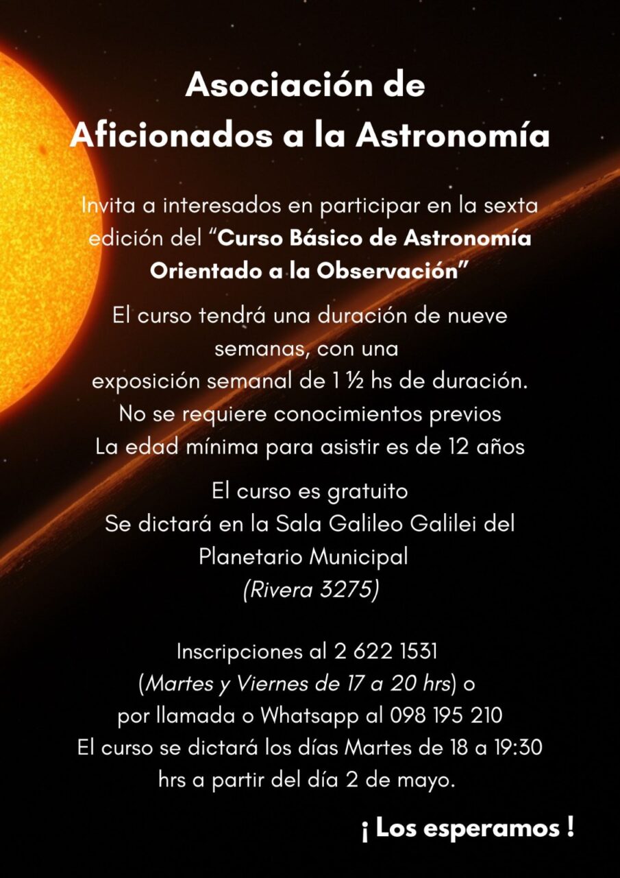 Nueve charlas que conforman un curso abarcativo, con consideración de la casi totalidad de los temas relevantes. Empero, con un nivel variable, entre básico y medio según el caso, de modo de que quien asiste sienta al finalizar que se le ha brindado información que le permite ubicarse frente al firmamento nocturno como frente a algo conocido, amigable, donde sabe qué buscar, dónde buscar y cómo buscar. No se requieren conocimientos previos. Dirigido especialmente a quienes no conocen del tema, pero con una base teórica firme en lo histórico, científico y técnico.