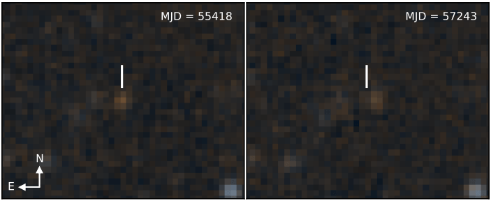 Figura 1: Dos imágenes de co-añadido de datos WISE separadas por 5 años que muestran cómo WISEA 1101 + 5400 se ha movido. La región que se muestra es 2,0” x 1,6” . [Figura 2 del paper].