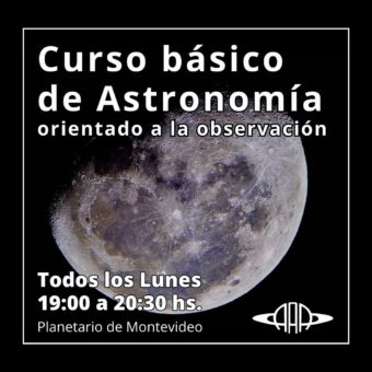 La Asociación de Aficionados a la Astronomía invita a todos los aficionados a participar del Curso Ba’sico de Astronomia orientado a la observación en su séptima edición. A partir del 13 de Mayo, todos los lunes de 19.00 a 20.30 hrs en la sala Galileo Galilei del Planetario de Montevideo (Rivera 3275). Curso gratuito a cargo de Mario Manzanares, no se requieren conocimientos previos. Único requisito ser mayor de 12 años. Inscripciones-2622 15 31 (Martes y Viernes 17 a 20hrs.) Llamada o Whatsapp 098 195 210. Hacemos hincapié en la puntualidad dado que el Parque de la Amistad cierra sus…